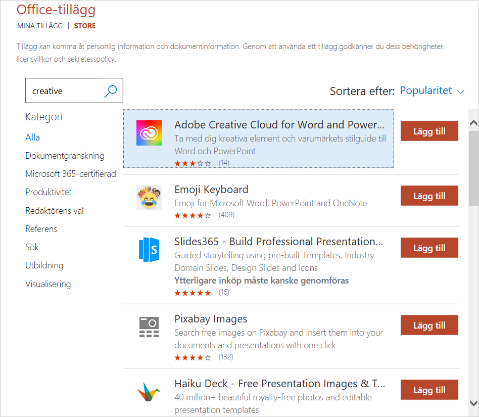 För att snabbare hitta önskat tillägg kan du söka med texten Creative i sökrutan hos fönstret Office-tillägg. Markera tillägget Adobe Creative Cloud for Word and PowerPoint och klicka på knappen Lägg till för att installera tillägget. Efter installation måste du en gång för alla logga in med ett Adobe ID från någon av de användare som arbetar med Adobes tillämpningsprogram på ert företag.