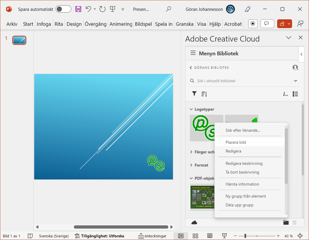 Logotyper, bilder och PDF-objekt kan användas i PowerPoint