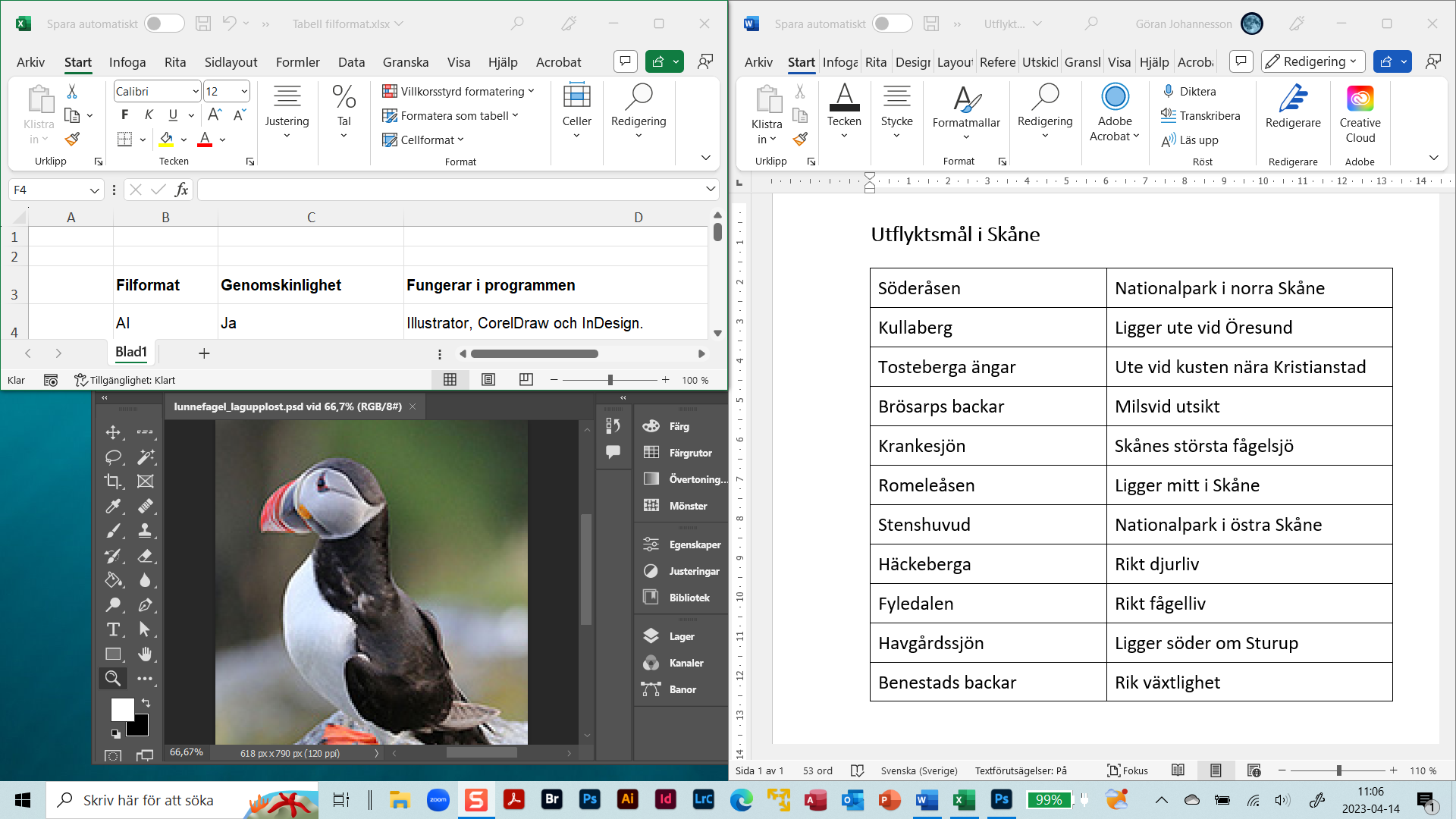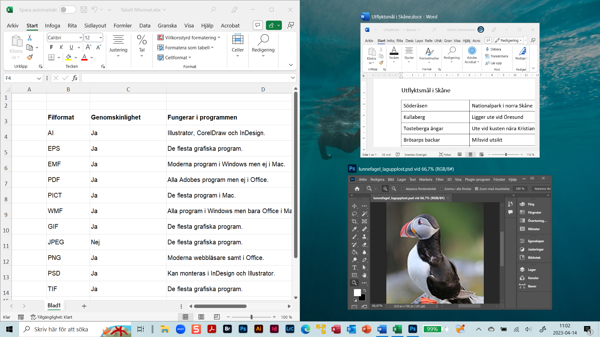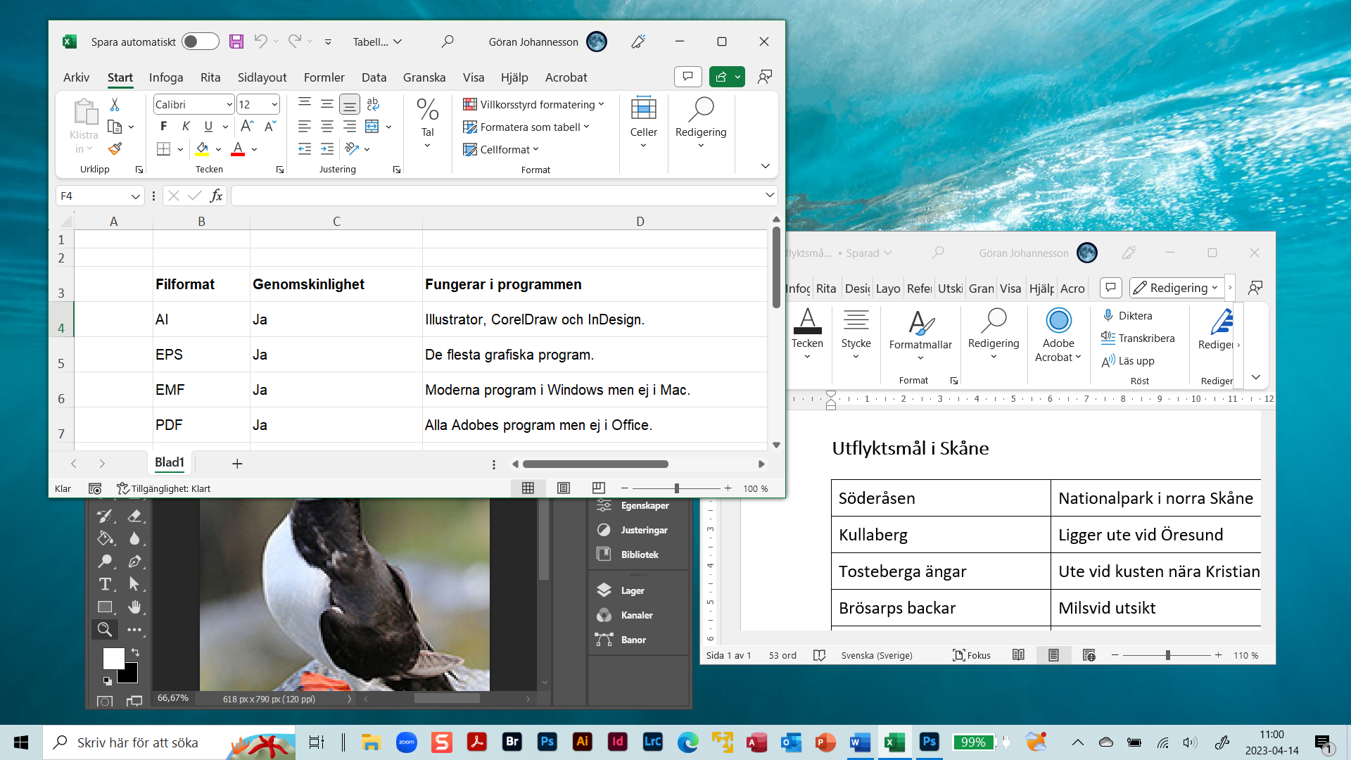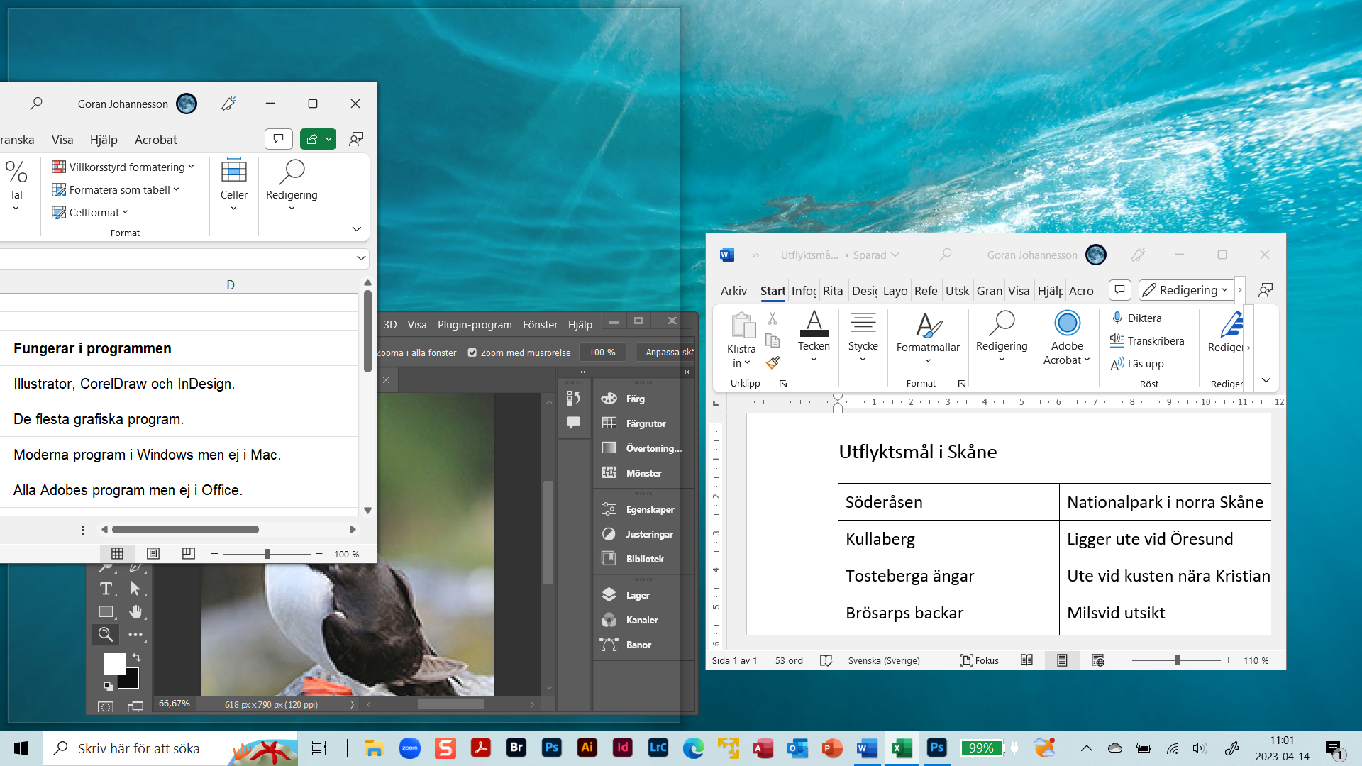 Hos denna dator är tillämpningarna Excel, Word och Photoshop öppna med var sina dokument i tre olika fönster.