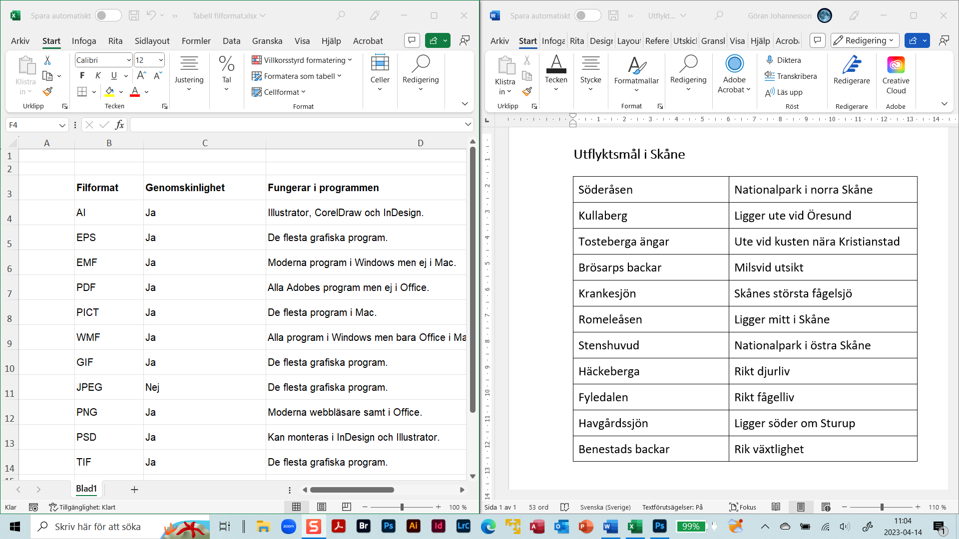 Fönstren hos de öppna programmen Excel och Word visas nu perfekt positionerade på var sin skärmhalva.