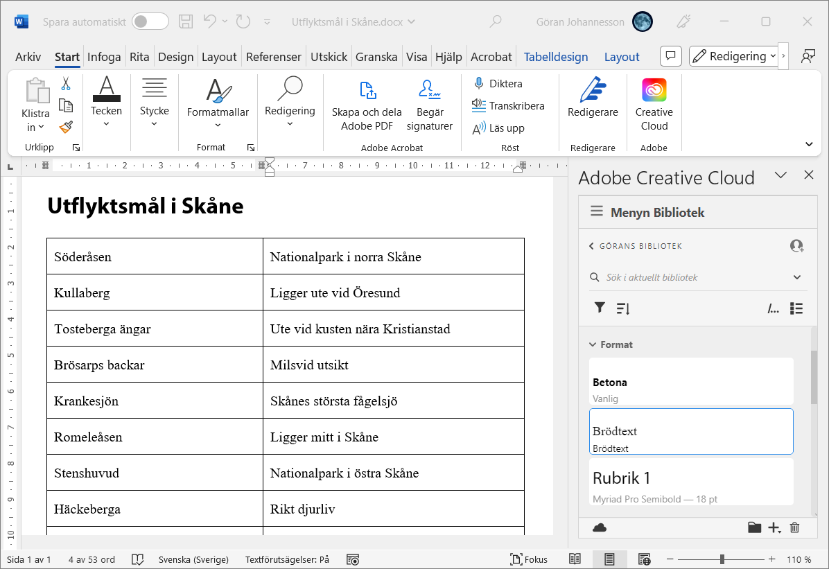 Textformat i Creative Cloud-bibliotek kan användas i Word