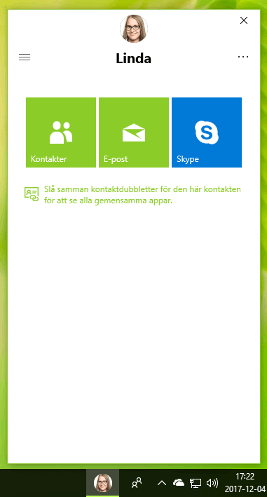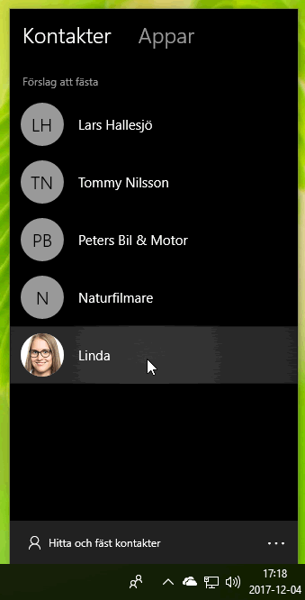 Du kan välja att nåla fast miniatyrer med bilder på vissa kontakter nere i aktivitetsfältet. När du väljer en kontakt i listan så visas knappar med bekväm åtkomst till apparna Kontakter, E-post och Skype. Om du väljer E-post så visas en historik med de senaste mejlen från den aktuella personen.