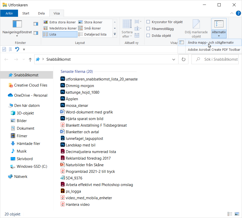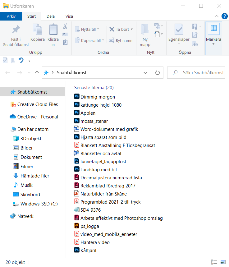När du öppnar Utforskaren för att hantera filer i Windows och väljer visningsformen Snabbåtkomst till vänster så presenteras normalt en lista med 20 av de senast öppnade filerna hos datorn. Detta kan i vissa fall vara bekvämt när du vill arbeta vidare med ett projekt som du nyligen redigerat. Men i de flesta fall så innehåller listan filer som du inte längre behöver ha tillgång till.