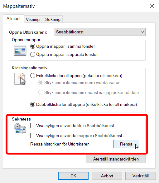 Utforskaren visar då dialogrutan Mappalternativ där du kan anpassa vad som visas i Snabbåtkomst. För att stänga av visningen av filhistoriken tar du bort bockarna vid alternativen Visa nyligen använda filer i Snabbåtkomst och Visa nyligen använda mappar i snabbåtkomst. För att rensa den befintliga listan klickar du dessutom på knappen Rensa. Stäng därefter dialogrutan via knappen OK.