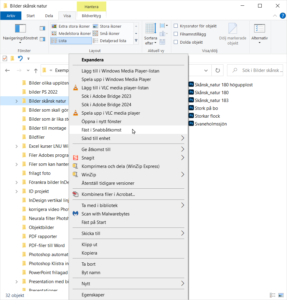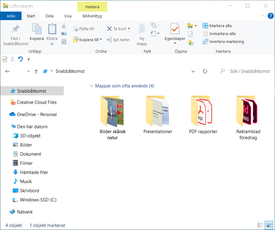 För att visa de mappar som du arbetar mest med i Snabbåtkomst så navigerar du till en mapp i taget via filhierarkin till vänster, markerar mappen, högerklickar och väljer kommandot Fäst i Snabbåtkomst.