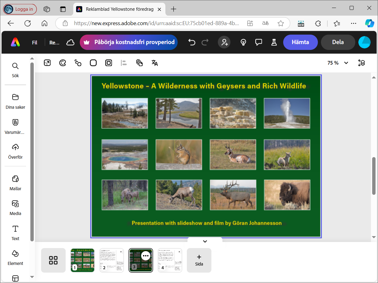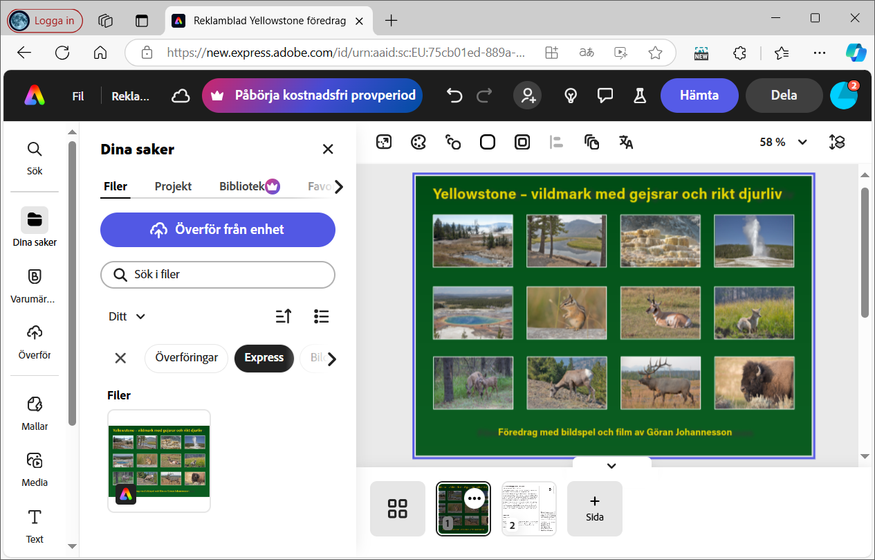 Här kommer månadens nyhetsbrev med tips för effektivare arbete i dina grafiska program. Distanskurs Arbeta effektivt med InDesignInDesign är idag det dominerande verktyget för professionell framtagning av reklammaterial, tidningar, tidskrifter, böcker, manualer, rapporter m m. Varje ny version får hela tiden mer avancerade funktioner som förbättrar möjligheterna men som samtidigt höjer kraven på kunskaper hos användarna. Målet med den här distanskursen i mötesprogrammet Zoom är att hjälpa erfarna användare att dra full nytta av InDesigns många kraftfulla funktioner vid framtagning av trycksaker och elektroniska dokument. Läs mer om distanskursen Arbeta effektivt med InDesign: Utöka monterade bilder via AI-teknik hos InDesignInDesign 2025 (version 20.0) har en användbar ny funktion benämnd Generativ utökning som via AI-teknik kan utöka monterade bilder så att de får ett annat bredd/höjd-förhållande än hos originalbilden. Med Generativ utökning kan du använda liggande motiv även när det behövs en kvadratisk eller stående bild. Medlemmar kan läsa mer i avdelningen Användartips till InDesign: Skapa grafik från textbeskrivning via Generativ AI hos IllustratorAdobe Illustrator 2025 (version 29.0) har en helt ny funktion som via Generativ AI kan skapa grafik helt automatiskt med utgångspunkt från en textbeskrivning, vilken du skriver in i ett nytt Kontextuellt aktivitetsfält. Medlemmar kan läsa mer i avdelningen Användartips till Illustrator: Redigera och översätt PDF-filer med Adobe ExpressDet nätbaserade onlineverktyget Adobe Express, som kan användas kostnadsfritt av alla, erbjuder bra funktioner för redigering av PDF-filer och även för översättning av PDF-filer till mer än 40 olika språk. För att börja arbeta med Adobe Express använder du med fördel webbläsaren Google Chrome och navigerar till nedanstående webbadress: När du skapat ett kostnadsfritt konto är det klart att börja använda tjänsten. Adobe Express kan både användas för att skapa nya filer i form av texter, bilder, filmer och animeringar samt för att redigera befintliga filer som förs över från din dator. Tjänsten använder ett eget filformat och alla filer som förs över till/från datorn konverteras från/till detta filformat helt automatiskt. Överför PDF-filer från datorn till Adobe ExpressFör att föra över en PDF-fil från din dator till Adobe Express väljer du Dina saker och klickar på den stora blå knappen Överför från enhet. I fildialogen som då visas navigerar du till och väljer önskad PDF-fil på din dator. När filen hämtats från datorn till Adobe Express visas den som en miniatyr i undre delen av området Dina saker. Om du klickar på miniatyren så öppnas den konverterade PDF-filen i det stora fönstret till höger så att du kan redigera den. Under det öppnade dokumentet visas miniatyrer för alla sidorna hos filen.
