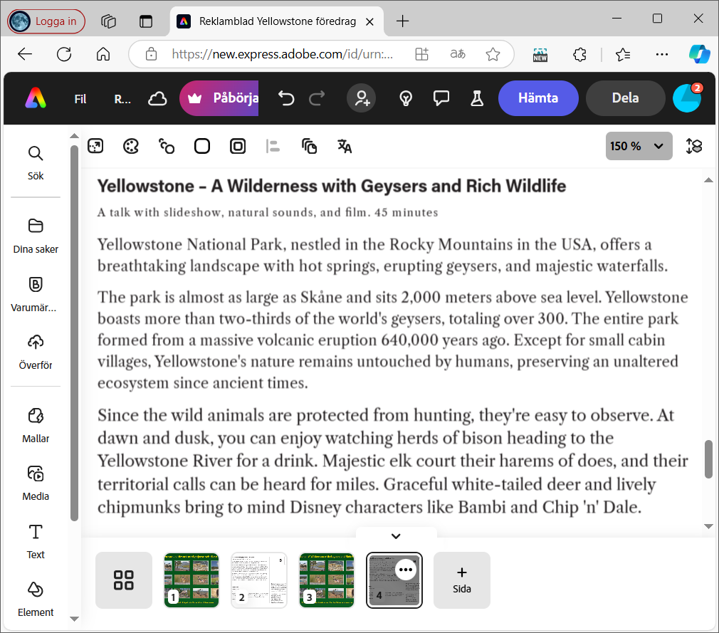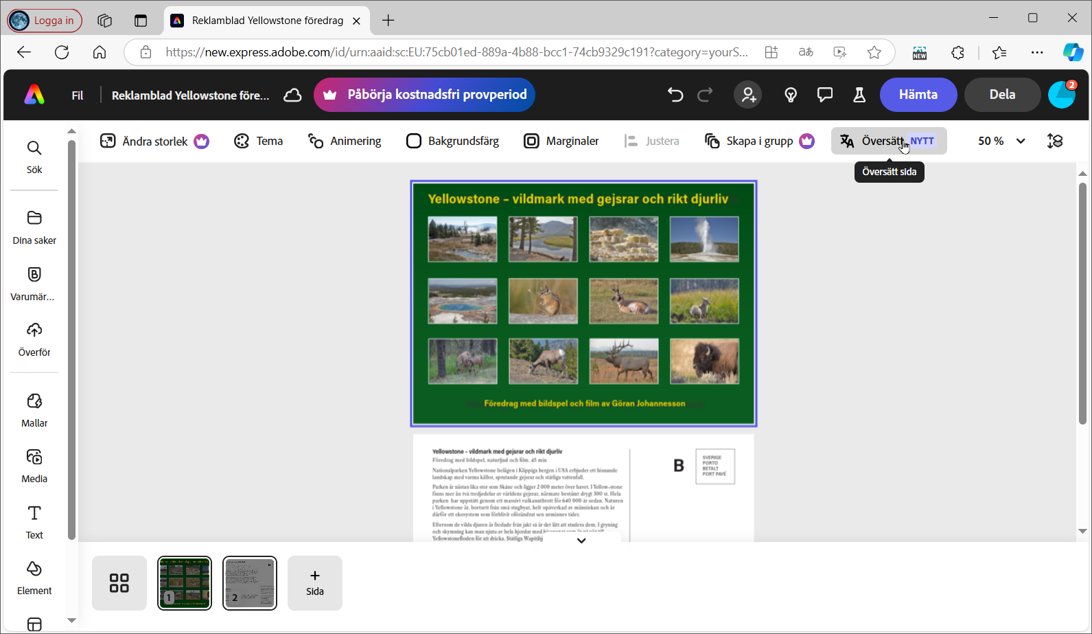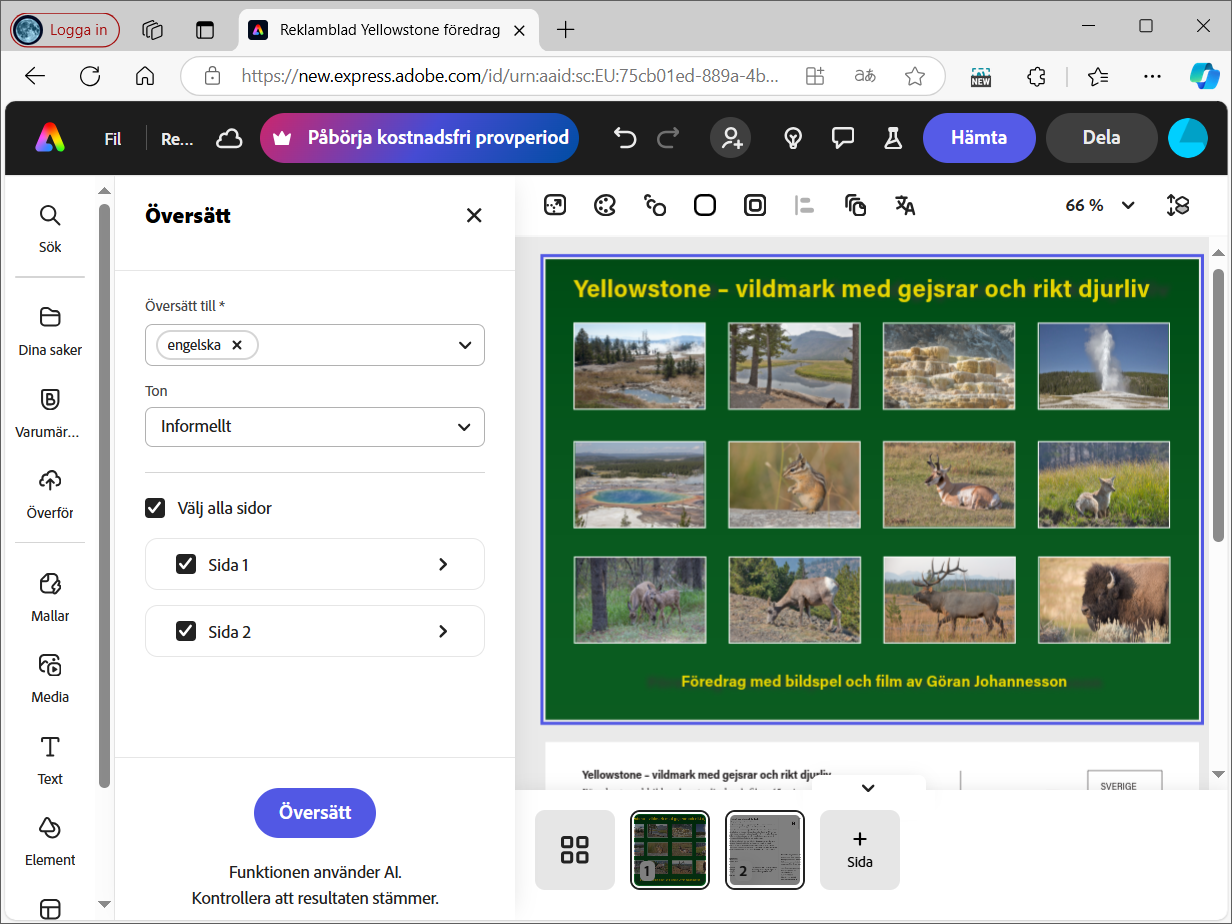 I de flesta fall blir resultatet bra vid översättning från svenska till engelska. Tjänsten är definitivt bättre på engelsk språkbehandling än vad jag själv är. Men vid behov kan du naturligtvis redigera den översatta texten i Adobe Express om du hittar några brister.