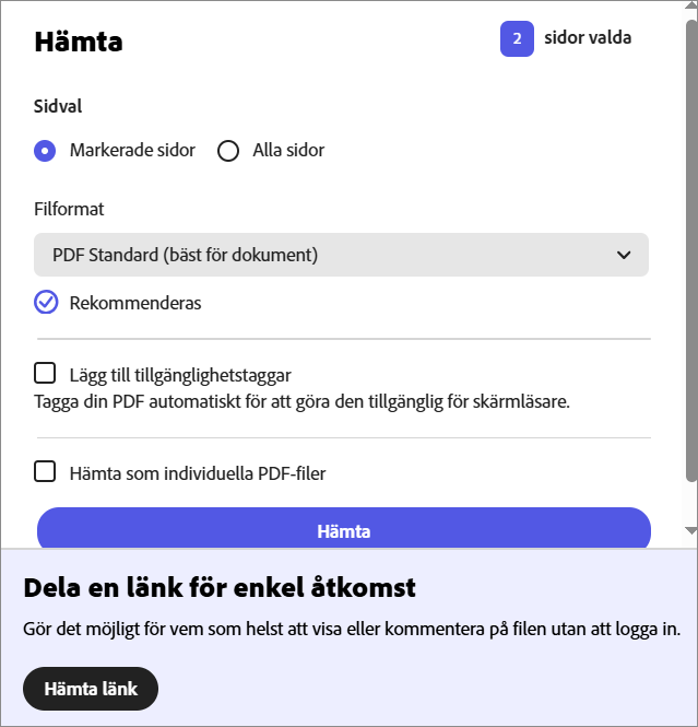 Innan hämtningen påbörjas måste du i en dialogruta bekräfta om du vill hämta hela filen eller enbart de sidor som är markerade i tjänsten. Du kan också välja bland olika alternativ för Filformat vid hämtningen. PDF standard ger måttligt stora filer medan PDF för utskrift ger bättre bildkvalitet.