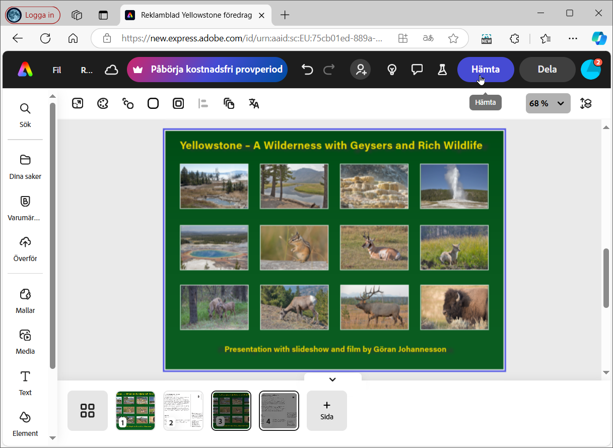 Hämta filer från Adobe Express till datornNär du är nöjd med dina redigeringar och översättningen kan du hämta tillbaka en ny version av PDF-filen till din dator via den blå knappen Hämta uppe till höger. Adobe Express konverterar då tillbaka filen från sitt eget filformat till PDF. De använda teckensnitten bäddas in i PDF-filen så att texten kan visas korrekt även på datorer som inte har teckensnitten tillgängliga.