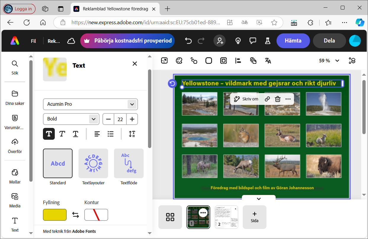 Vi har nu överfört en tvåsidig PDF-fil som konverterats till Adobe Express eget filformat.Redigera text i filerFör att redigera texten hos den öppnade filen klickar du på knappen Text nere till vänster, vilket tar fram ett stort antal verktyg för texthantering i området Text som nu visas istället för Dina saker. Om du klickar i ett textavsnitt hos dokumentet så får du fram verktyg för teckensnitt, stil, storlek m m. Lägg märke till att rubriken har utformats med ett eget teckensnitt hos Adobe Express, vilket har namnet Acumin Pro. Detta har vid konverteringen ersatt PDF-filens ursprungliga teckensnitt som är Arial Black. De teckensnitt som används hos Adobe Express har snarlikt utseende och omfång som originaldokumentets teckensnitt.