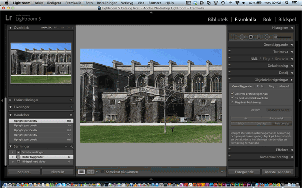Möjligt att skapa bildspel från stillbilder och rörlig video Förbättrat verktyg för automatisk borttagning av defekter i bilder Verktyget Fläckborttagning som finns tillgängligt i modulen Framkalla används för att ta bort fläckar, dammkorn, blänk och andra defekter hos bilder. Verktyget är helt automatiskt och du behöver bara klicka (och ev även dra) över defekten för att ta bort den. Programmet hämtar då automatiskt pixlar från närliggande områden och fyller i defekten så att den försvinner. Vid behov kan du ändra Storlek och Opacitet så att lagom stort område påverkas. Du kan även hålla ner tangenten Ctrl (Kommando i Mac) för att bestämma var programmet skall hämta pixlar ifrån. Ny funktion för upprätning av horisont och perspektiv Hos många bilder är det nödvändigt att räta upp horisonten eftersom kameran hållits snett vid exponering. Vid fotografering av byggnader händer det dessutom lätt att perspektivet blir snett eftersom man är placerad över, under, eller vid sidan av motivets mitt. Funktionen Upright som finns tillgänglig i modulen Framkalla under fliken Objektivkorrigeringar rättar till sådana fel helt automatiskt. Prova med de olika alternativen Automatisk, Nivå, Lodrätt eller Fullständig tills du får bästa resultat. Om du dessutom slår på funktionen Begränsa beskärning så beskärs bilden automatiskt så att du slipper tomma områden i kanterna.  Trolleriet är ett faktum! Originalbilden överst har korrigerats helt automatiskt så att den motsvarar en bild tagen med kameran rakt framför motivet. Nytt Radiellt filter som utför selektiv efterbehandling i bilder Modulen Efterbehandla har ett nytt verktyg benämnt Radiellt Filter som du kan använda för att efterbehandla valda områden i bilder. Du väljer verktyget och ritar en eller flera ovaler på önskade platser i bilden. Därefter ställer du in önskad effekt som skall läggas på bilden i områdena med ovaler. Det går att ändra Exponering, Färg, Mättnad m fl egenskaper. Vid behov kan du även finjustera storlek och position hos ovalerna.  Exempel på inställningar för ett radiellt filter hos Lightroom. Funktion för offline redigering av bilder Lightroom samlar information om alla bilder och filmer i en eller flera katalogfiler som normalt lagras lokalt på hårddisken hos den aktuella datorn. Originalfilerna lagras däremot oftast på externa skivenheter vilket ger möjlighet till betydligt högre kapacitet. Hos äldre versioner av Lightroom krävs att datorn har tillgång till de externa skivorna för att det skall vara möjligt att utföra efterbehandling och katalogisering av filer. Lightroom 5 ger dig möjlighet utföra sk offline redigering vilket innebär att du kan efterbehandla och märka upp filer med metadata utan att originalfilerna är tillgängliga. Enda kravet för detta är att du först skapat Smarta förhandsvisningar för de aktuella filerna. Detta kan antingen utföras i samband med katalogisering eller i efterhand via kommandot Bibliotek-Förhandsvisningar-Skapa smarta förhandsvisningar. Originalfilerna uppdateras då automatiskt när aktuell skiva monteras på datorn. Möjligt att skapa bildspel från stillbilder och rörlig video Lightroom 5 gör det möjligt att blanda stillbilder och videofilmer i bildspel. Du kan dessutom spela upp ljudfiler med musik eller effekter under pågående bildspel. Resultatet kan exporteras till en videofilm i MP4-format som du kan spela upp på de flesta moderna datorer, såväl Windows som Mac. Lightroom 5 ingår i Creative Cloud-abonnemanget men kan även köpas som ett traditionellt programpaket för 964 kr. En uppgradering från tidigare versioner kostar 664 kr. Microsoft har lanserat Office Mobile för iPhone Appen Office Mobile för iPhone finns nu tillgänglig för kostnadsfri nerladdning från den amerikanska avdelningen av Apple App Store. Europeiska språkvarianter förväntas komma inom de närmaste veckorna. Office Mobile för iPhone låter dig öppna och redigera befintliga dokument från Word, Excel och PowerPoint, under förutsättning att de är lagrade på Microsofts molntjänst Office 365. Alla kunder som abonnerar på Office 2013 har tillgång till denna personliga molntjänst. Appen kan även användas för att skapa nya Word- och Excel-dokument men inte nya PowerPoint-dokument.  Office Mobile låter dig redigera Office-dokument som är lagrade på Office 365. Dokument som öppnas med Office Mobile får samma utseende som hos motsvarande tillämpningsprogram i en persondator. Redigering av långa dokument underlättas av de nya navigeringsfunktionerna hos programmen i Office 2013.  Exempel på framtagning av diagram med Office Mobile. Nya versioner av programmen i Adobe Creative Cloud Alla som prenumererar på Adobe Creative Cloud kan nu ladda ner uppdaterade versioner av programmen Photoshop, InDesign, Illustrator m fl. Bland flera intressanta nyheter kan nämnas: -