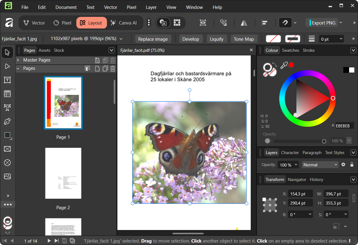 Programmet Affinity Studio med funktionen Layout aktiv. Det visade dokumentet är en PDF-fil som har öppnats direkt och redigerats vidare i programmet.