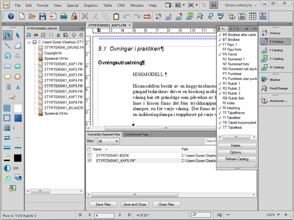 FrameMaker är inte lika välkänt som övriga layoutprogram men bland informatörer är programmet vanligt för arbete med stora projekt såsom handböcker, böcker och kataloger. FrameMaker finns i flera snarlika varianter för Macintosh, Windows och olika Unix-dialekter. De senaste versionerna FrameMaker 8, 9, 10, 11 och 12 fungerar bra med alla moderna versioner av Windows. Adobe har tyvärr slutat utveckla FrameMaker för Macintosh och den senaste versionen FrameMaker 7.0 är därför inte anpassad för Mac OS X utan måste köras i Classic-läge, vilket omöjliggör användning på nyare modeller av Macintosh. I denna avdelning av ProgramSupport har jag sammanställt mina egna erfarenheter från det senaste decenniets arbete med långa dokument i FrameMaker. Här finns ett antal konkreta tips som hjälper både nybörjare och mer vana användare att arbeta effektivt med FrameMaker. Om du inte får svar på dina frågor så rekommenderas avdelningen Problemlösning med information om bildfilsformat, teckensnitt, utskrifter och datautbyte. |
