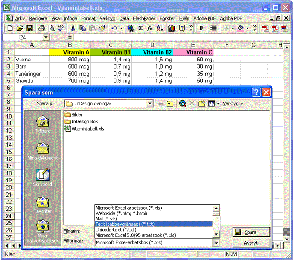 Den säkraste metoden för att överföra tabeller till layoutprogram är därför att spara Excel-dokumentet som en textfil utan utformningar. I en sådan textfil skiljs olika kolumner i tabellen åt via tabbtecken medan varje rad avslutas med tecknet Enter.
