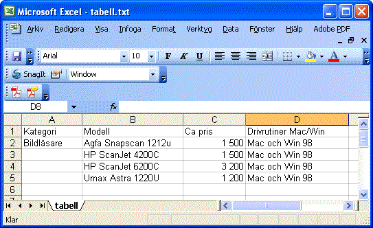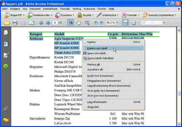 Överför text från tabeller i PDF-filer till andra programFör att överföra texten hos en tabell börjar du med att markera önskad del av tabellen med Markeringsverktyget hos Acrobat. Detta gäller för versionerna 7, 8 och 9 av Acrobat. Hos Acrobat 6 används istället verktyget Markera tabell. Om du därefter högerklickar på det markerade området visas en meny med tre olika alternativa kommandon för textöverföring, nämligen Kopiera som tabell, Spara som tabell och Öppna tabell i kalkylblad. Kopiera som tabellDet första alternativet erbjuder den bekvämaste metoden för överföring. Kommandot Kopiera som tabell placerar en kopia av den markerade texten i urklipp vilket gör det möjligt att klistra in den med bibehållen tabellstruktur i valfritt annat program. Begränsningen med kopiera/klistra in är dock att informationen går förlorad så snart du utför en ny kopiering.