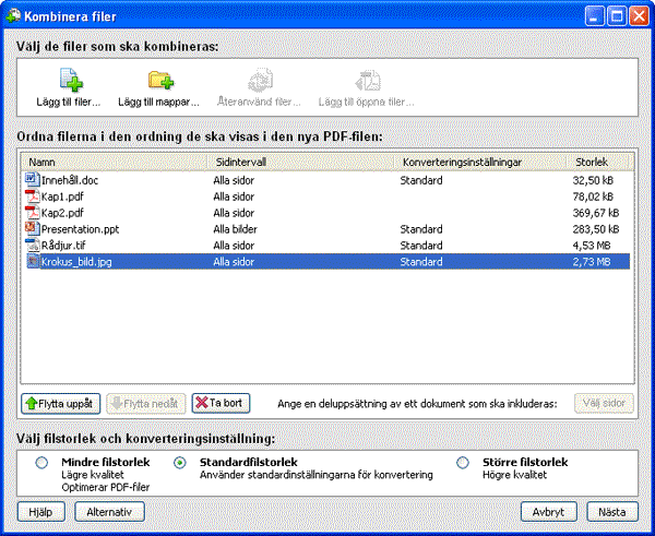 Skapa en gemensam PDF-fil från flera dokumentI många fall har man behov av att skapa en gemensam PDF-fil från flera olika dokument, såväl befintliga PDF-filer som dokument i andra filformat. Naturligtvis är det möjligt att först ta fram PDF-filer från varje del och sen slå samman dessa delar manuellt. Acrobat Professional, från och med version 7, har dock en användbar funktion som kan utföra det mesta av arbetet automatiskt. Börja med att välja kommandot Arkiv-Skapa PDF-Från flera filer. Programmet öppnar då dialogrutan Kombinera filer där du via knapparna Lägg till filer eller Lägg till mappar kan välja ut de filer som skall ingå i den gemensamma PDF-filen. Du får då upp en fildialog som låter dig navigera till önskade filer/mappar en i taget. Efterhand som du väljer filer visas deras filnamn i listan hos dialogrutan. När du är klar går det även att ändra ordningen mellan filerna genom att dra dem i listan. Omvandlingen till en gemensam PDF-fil startas när du klickar på knappen Nästa. I den följande dialogrutan väljer du alternativet Sammanfoga filer till en enda PDF och klickar på knappen Skapa.