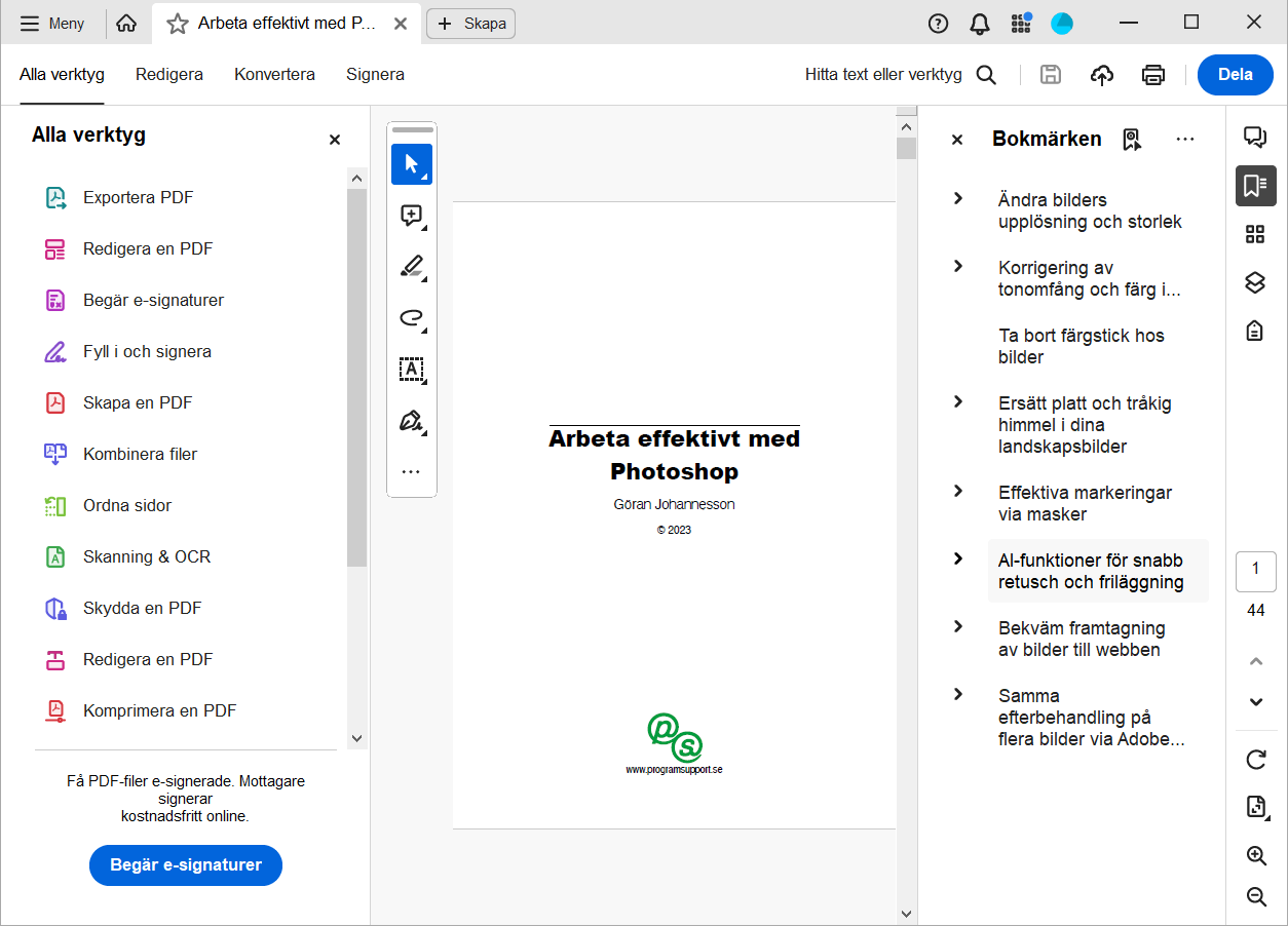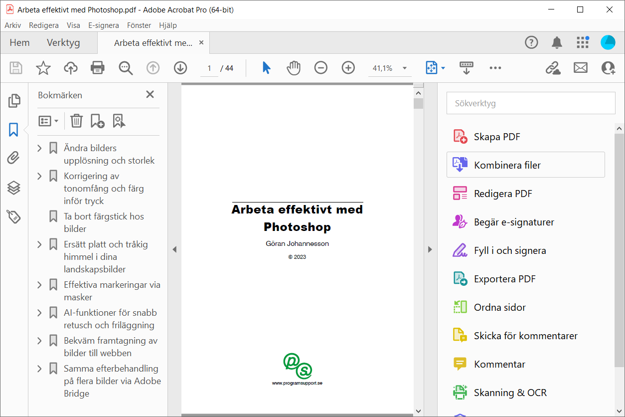 Adobe Acrobat är en hel familj program som låter dig skapa och efterbehandla PDF-filer från de flesta andra tillämpningsprogram. PDF (Portable Document Format) är en vanlig standard för distribution av elektroniska dokument. PDF-filer används både för att överföra dokument med hög kvalitet till tryck och för distribution via webben. PDF-filer innehåller en komplett sidbeskrivning och är därför oberoende av datorplattform, vilket tillämpningsprogram som använts för framtagning och teckensnitten som används i dokumenten. Det enda som man behöver för att ta del av PDF-filer är det fria programmet Adobe Reader (tidigare Acrobat Reader). I denna avdelning av ProgramSupport finns ett antal konkreta tips som hjälper både nybörjare och mer vana användare att arbeta effektivt med Acrobat vid framtagning och efterbehandling av PDF-filer. Beskrivningen baseras dels på Acrobat 7, 8 och 9 medan några tips enbart gäller Acrobat X, Acrobat XI och Acrobat DC. Användargränssnittet hos de tre senaste skiljer sig en del från tidigare programversioner. Om du inte får svar på dina frågor så rekommenderas avdelningen Problemlösning med information om bildfilsformat, teckensnitt, utskrifter och datautbyte. |