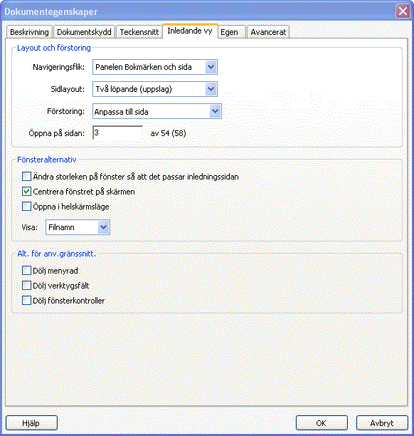 Ange inledande vy när PDF-filer öppnasFör att underlätta användningen av PDF-filer är det lämpligt att du som producent ställer in filerna så att de öppnar sig automatiskt i vyer som gör det lättare för läsarna att ta del av innehållet. Begreppet vy anger vilken/vilka sidor som öppnas, dokumentets förstoringsgrad, layouten på skärmen, vilka bläddringshjälpmedel som skall vara synliga samt ett antal andra alternativ för användargränssnittet hos Acrobat. För att ställa in den inledande vyn hos en PDF-fil behöver du något av programmen Adobe Acrobat eller Adobe Acrobat Pro. Inställningarna utförs i dialogrutan Dokumentegenskaper som du tar fram via kommandot Arkiv-Egenskaper och väljer fliken Inledande vy. Vid listan Navigeringsflik kan du välja om enbart sidan skall visas eller om även Sidor (sidminiatyrer) alternativt ev Bokmärken skall visas till vänster om sidan. Vid listan Sidlayout väljer du om enbart en sida skall visas åt gången eller om visningen skall ske via uppslag med två närliggande sidor. Alternativet löpande innebär att du kan se flera sidor/uppslag samtidigt genom att zooma ur i dokumentet. Vid listan Förstoring kan du ange önskad förstoringsgrad hos dokumentet eller välja Anpassa till sida som innebär att dokumentet fyller ut bildskärmen hos datorn. Alternativen vid Fönsteralternativ gör det bla möjligt att öppna PDF-filer i Helskärmsläge utan några menyer och fönsterkontroller. Detta används med fördel till datorbaserade presentationer. Presentationen styrs då med piltangenterna och avbryts med tangenten Esc.