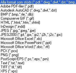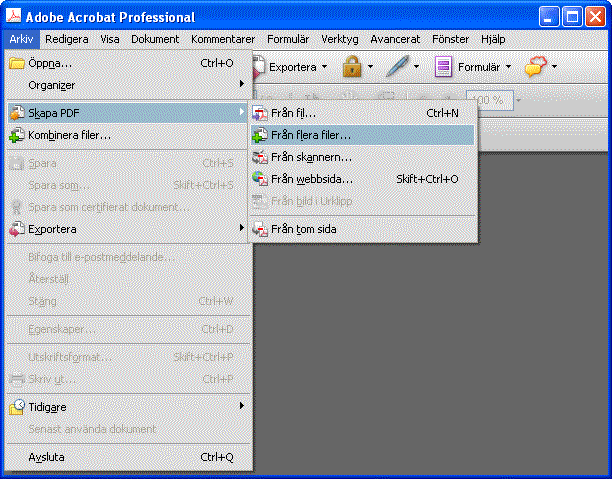 Skapa PDF-filer med Adobe AcrobatPDF-filer kan tas fram på flera olika sätt. Den enklaste metoden är att använda Adobe Acrobat som kan konvertera många vanliga filtyper till PDF-format. Detta fungerar med standardfilformat som RTF, TXT, HTML, de flesta punktbildsformat samt filer från AutoCAD, Project, Visio och Office. Kommandot för att skapa PDF-filer med denna metod är Arkiv-Skapa PDF-Från fil.
