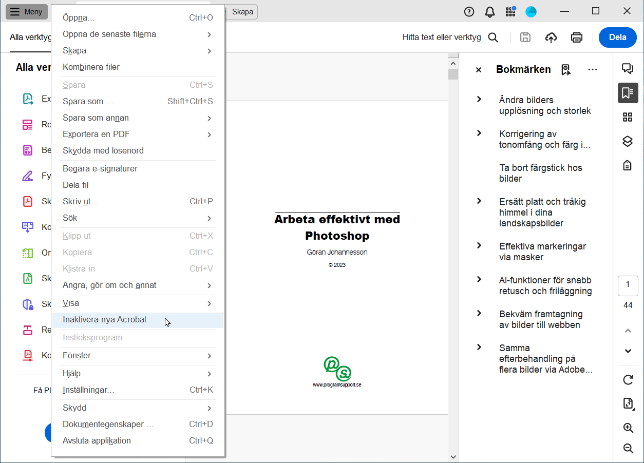 Ställ om programmen till de gamla gränssnittenAlla som känner sig tveksamma till de nya gränssnitten hos Acrobat kan via ett kommando ställa om programmen så att de återgår till de gamla gränssnitten. Detta utför du genom att klicka på knappen Meny längst uppe till vänster och välja kommandot Inaktivera nya Acrobat.