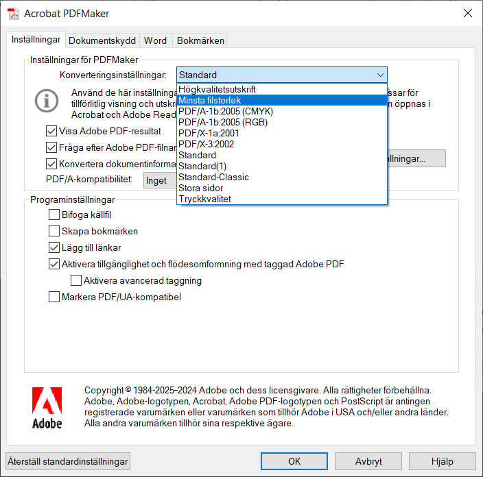 Skapa PDF-filer från Office med PDFMakerNär du skall skapa PDF-filer från Office-programmen Word, Excel och PowerPoint är det bekvämt att använda makrot PDFMaker. Med PDFMaker får du även utökad funktionalitet hos PDF-filerna som automatiska bokmärken från Word samt bildövergångar mellan bilder från PowerPoint. Makrot erbjuder dessutom ett bekvämt sätt att välja komprimering och därmed bildkvalitet hos PDF-filerna. Om du har Office-programmen på din dator när Acrobat installeras så lägger installationsprogrammet automatiskt till makrot PDFMaker. Makrot kan därefter manövreras via var sin menyflik, benämnd Acrobat, hos Office-programmen. |