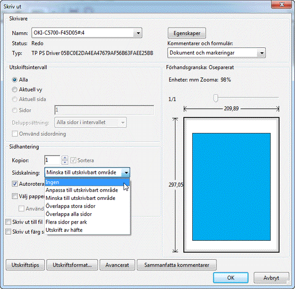 Undvik omskalning vid utskrift av PDF-filerDe allra flesta som arbetar med PDF-filer har säkert råkat ut för att sidor förminskas vid utskrift från Adobe Reader eller Acrobat Pro. Risken är då stor att man börjar felsöka i fel ände av kedjan och misstänker att felet uppstått vid framtagning av PDf-filerna. Men felet beror faktiskt på en olämplig inställning i dialogrutan för utskrift! Av någon anledning har Adobe valt att förinställa Acrobat så att inställningen för Sidskalning i dialogrutan Skriv ut har förinställningen Minska till utskrivbart område. Resultatet blir att sidorna förminskas till ca 98% av sin originalstorlek. Syftet med denna inställning är säkert att eliminera risken för att de yttre kanterna hos dokumenten hamnar i skrivarens icke skrivbara område. Men om du vid framtagningen av dina dokument undviker att placera objekt ända ute vid papperskanten så finns ingen anledning att skala ner dokumenten vid utskrift. I de flesta fall är det därför bäst att välja alternativet Ingen för Sidskalning.