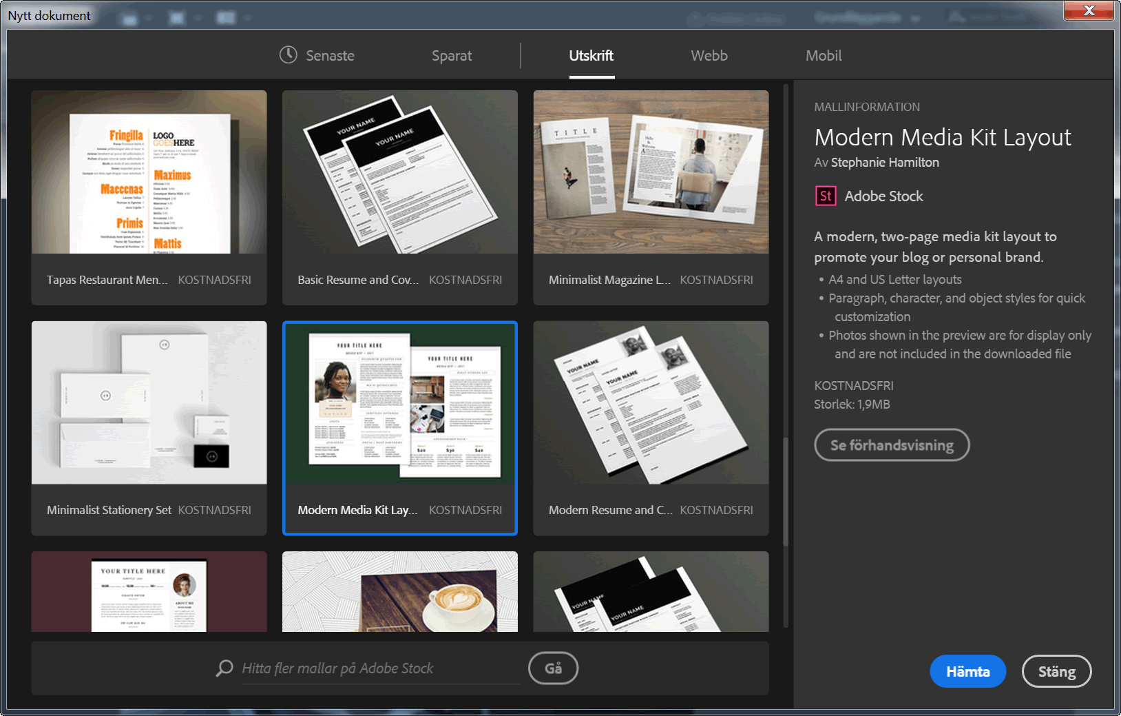 För att underlätta användningen av InDesign erbjuder Adobe nu färdiga malldokument som kan hämtas från Adobe Stock i samband med att du skapar nya dokument. Mallarna som hämtas kostnadsfritt är framtagna av professionella användare. Efter hämtning av en mall erbjuds du även att ladda ner de teckensnitt från Adobe TypeKit, vilka används i mallen men som saknas på din dator.