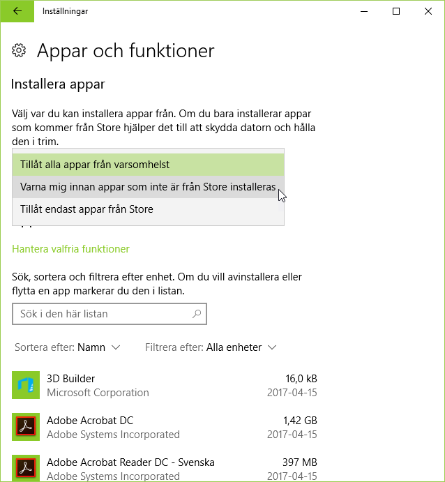 För att minska risken för att appar med okänd säkerhet orsakar problem i datorn går det nu att begränsa installation till enbart de appar som erbjuds via Store. detta sker via inställningen Appar och funktioner.