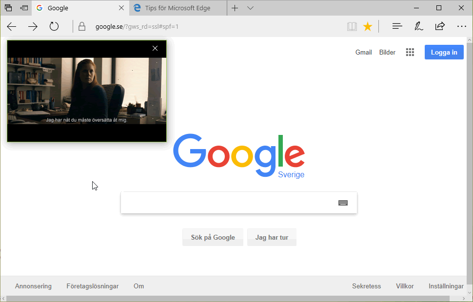 Uppspelning av en videofilm i ett eget fönster ovanpå webbläsarfönstret.