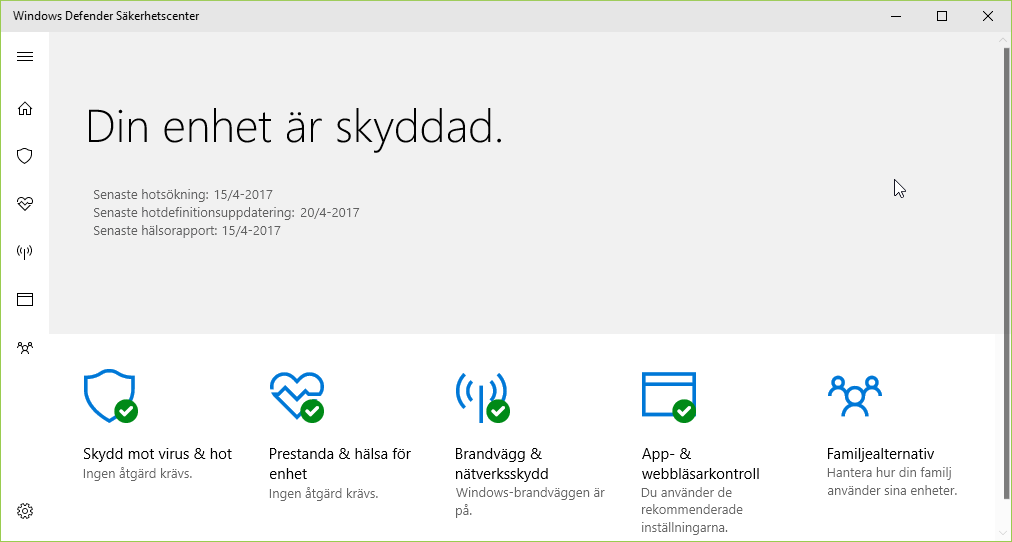 De gröna bockarna hos Windows Defender indikerar att allting fungerar normalt.