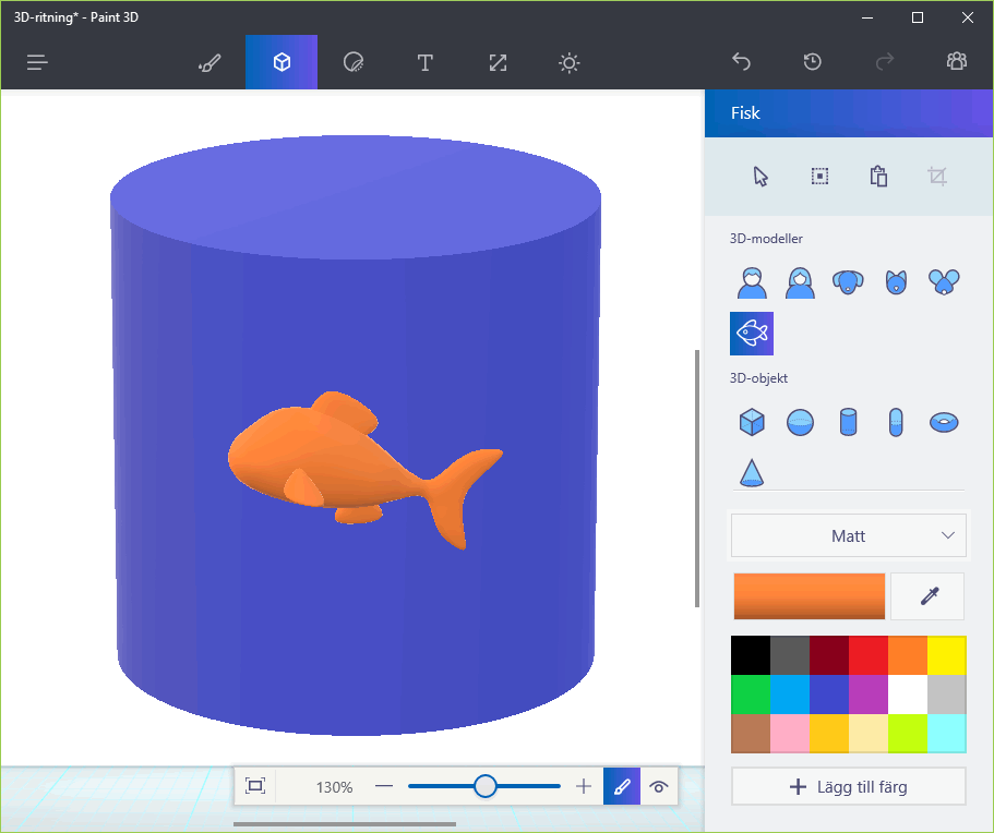 Bild som tagits fram med färdig 3D-modell (fisken) och färdigt 3D-objekt (cylindern).
