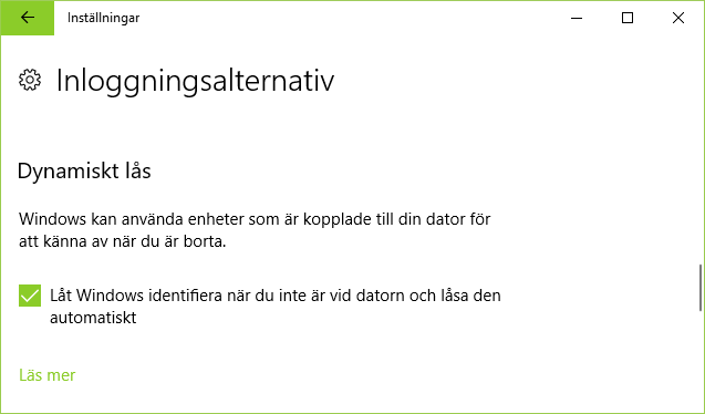 Om du parkopplar din mobil (iPhone eller Android) via Bluetooth och aktiverar inställningen för Dynamiskt lås så loggas datorn ut när du (med mobilen) avlägsnar dig från datorn. Detta är en bekväm funktion som förhindrar obehöriga från att använda din dator.