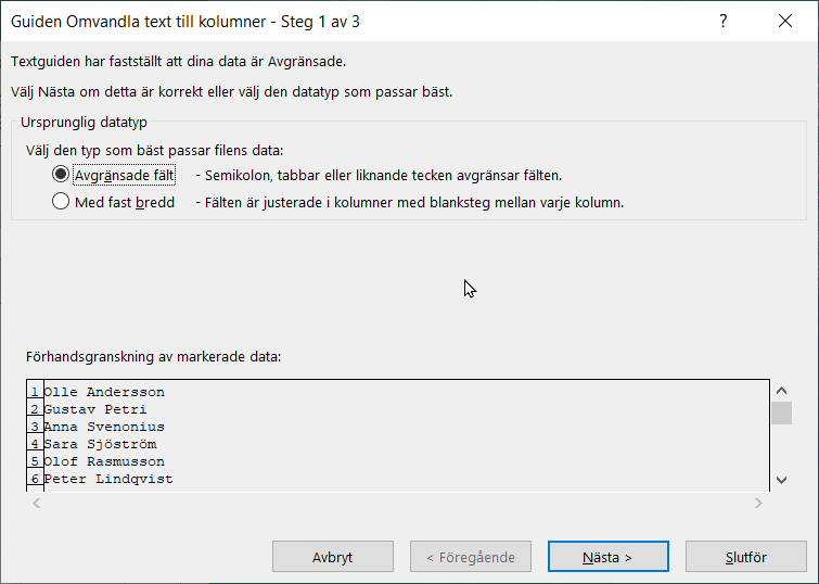 Programmet startar då guiden Omvandla text till kolumner där du i tre dialogrutor behöver bekräfta hur uppdelningen skall gå till. I dialogrutan Steg 1 a 3 bör du välja alternativet Avgränsade fält vilket ger dig möjlighet att i nästa steg ange vilket tecken som är avgränsare. Om du väljer Med fast bredd så måste fälten vara avgränsade med mellanslag.