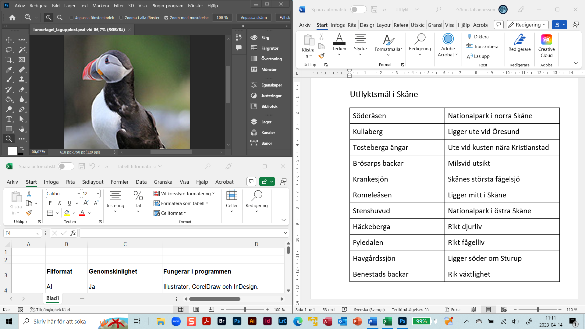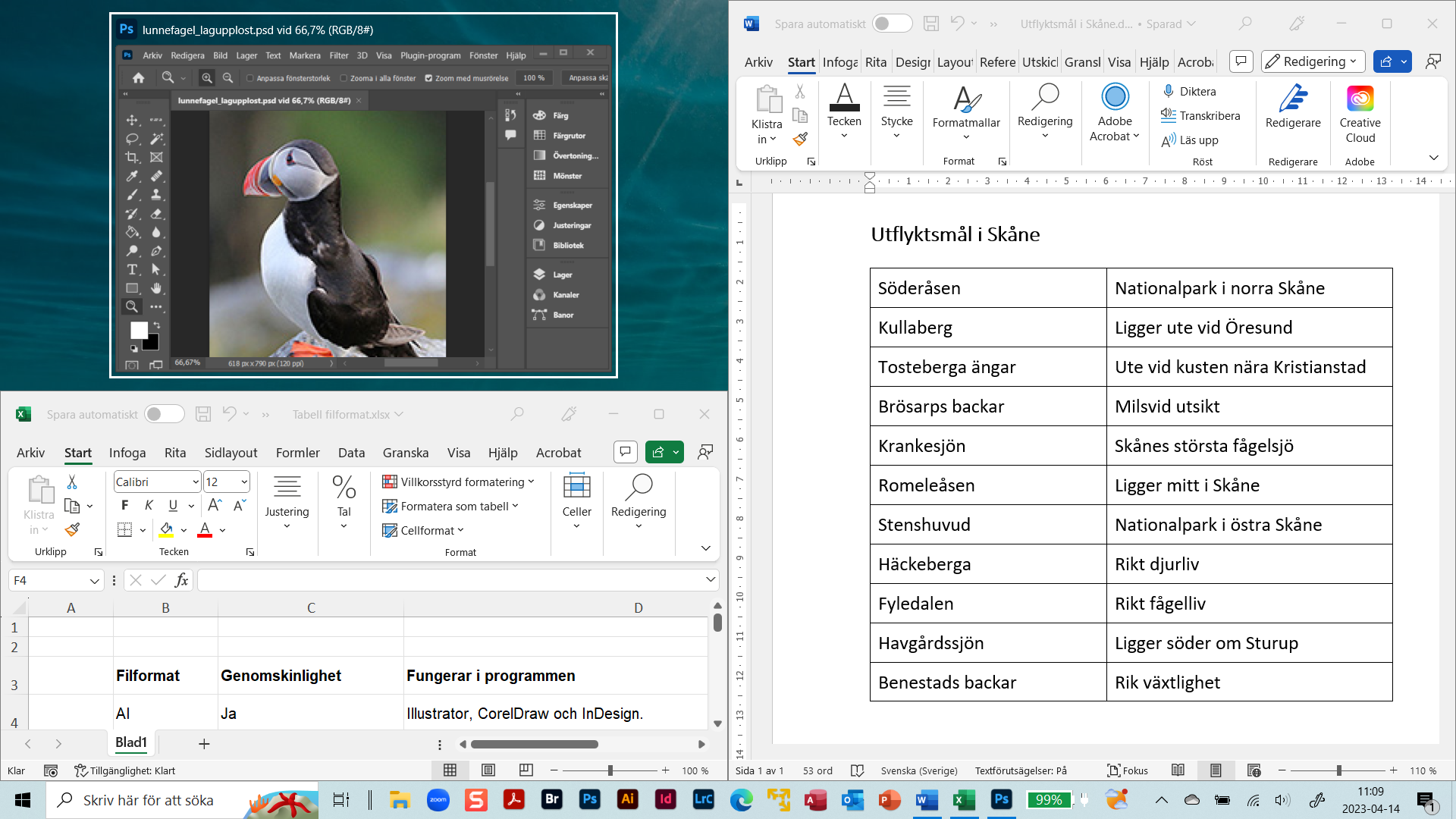 Hos denna dator är tillämpningarna Excel, Word och Photoshop öppna med var sina dokument i tre olika fönster.