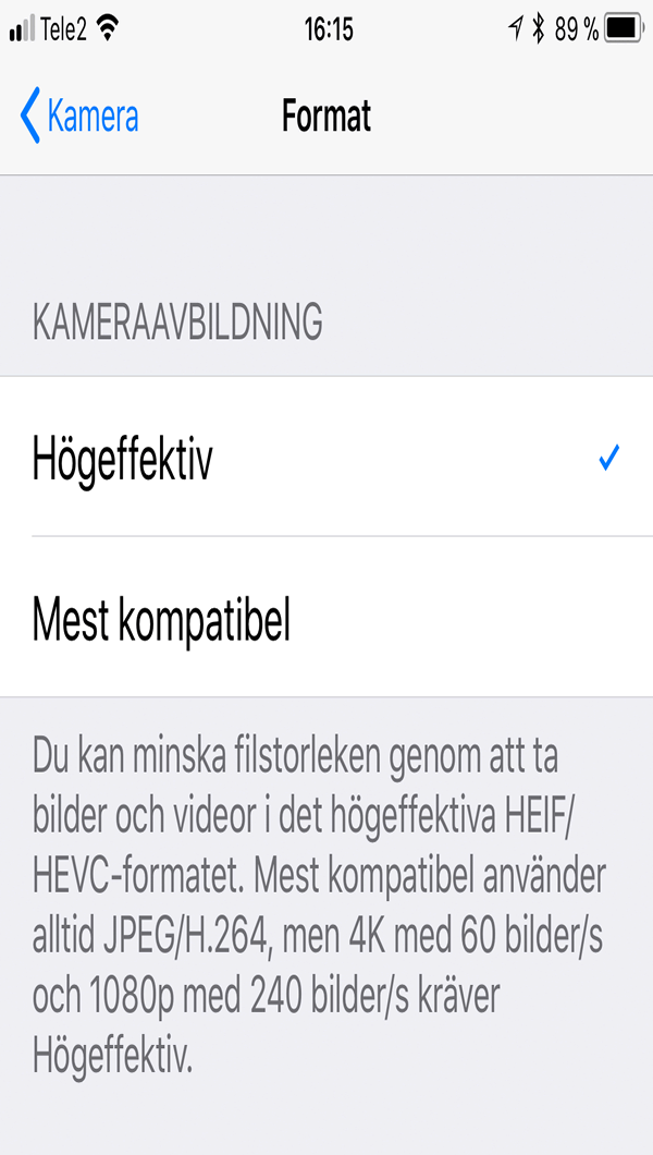 Du aktiverar användning av de nya formaten med Inställningar-Kamera-Format. I panelen Format som då visas kan du välja mellan Högeffektiv (de nya formaten HEIF och HEVC) eller Mest kompatibel (de äldre formaten JPEG och H.264). Det senare alternativet rekommenderas om du arbetar med Windows.