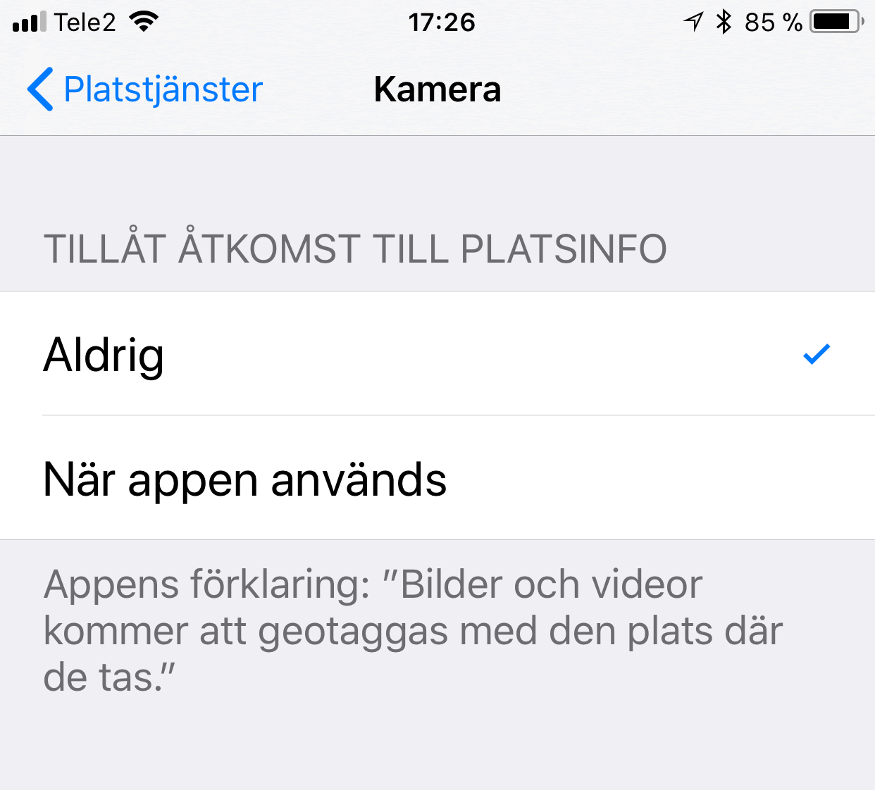 När du vill eliminera platsinformation för ett stort antal bilder så är det enklast att tillfälligt slå av GPS-lagringen i den mobila enheten. Du utför detta med Inställningar-Integritetsskydd-Platstjänster. Du behöver inte slå av platstjänster för hela enheten utan det räcker med att bläddra till appen Kamera och välja Aldrig för denna. Om du använder någon annan kameraapp så måste du avaktivera denna på samma sätt.