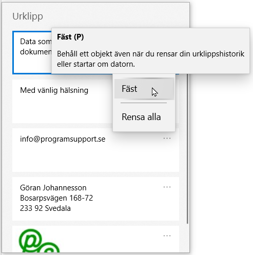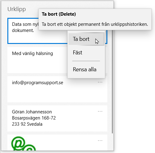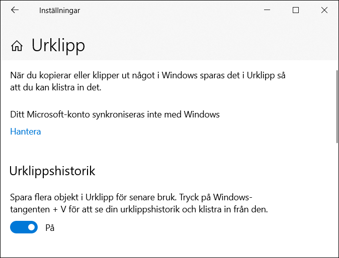 Du slår På funktionen Urklippshistorik i panelen Inställningar för Urklipp.