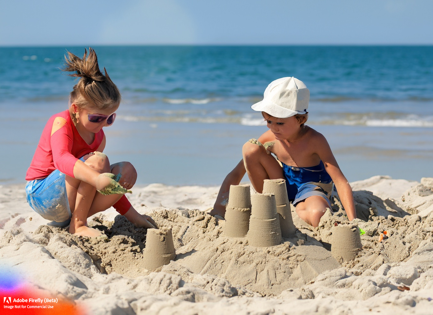 Här har jag provat att generera bilder med barn som bygger ett sandslott på en solig strand med havet i bakgrunden.