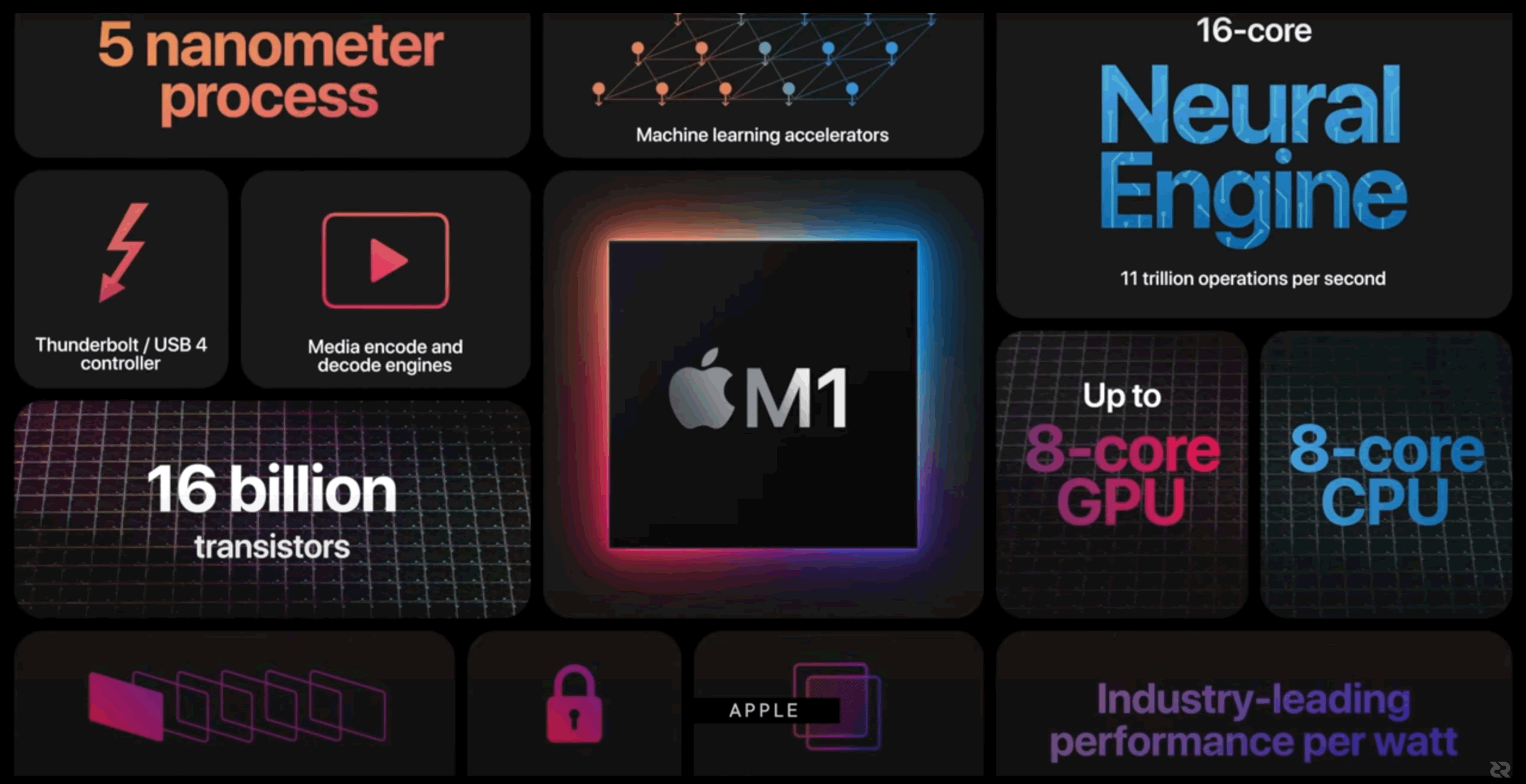 Den nya M1-processorn innehåller CPU, grafikkort, internminne och flera andra enheter vilket gör den till dagens mest komplexa chip med industriledande prestanda per förbrukad Watt.