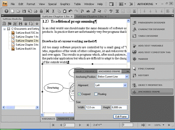 FrameMaker 9 med arbetsytan Authoring vald och panelen Anchored Frame uppvikt.
