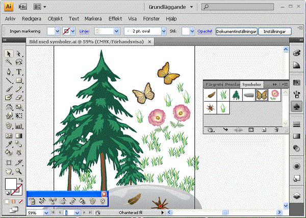 Skapa bilder via färdiga symbolerNyare versioner av Illustrator har en användbar funktion som låter dig ta fram ritningar via färdiga symboler som följer med programmet. En symbol är ett färdigt objekt som finns tillgängligt via panelen Symboler. Programmet levereras med hundratals färdiga sådana symboler inom flera olika motivområden. För att använda en symbol tar du fram önskad kategori genom att klicka på knappen Symbolbibliotek-menyn längst ner till vänster i panelen Symboler. Efter att du valt kategori i menyn öppnar programmet en ny panel med en grafisk översikt över de symboler som ingår i den valda kategorin. Du kan antingen dra en symbol från panelen till din ritning eller använda verktyget Spreja symbol som målar flera förekomster av den valda symbolen på ritningsytan. Den stora fördelen med symboler är att de bara tar upp filstorlek för ett objekt, oberoende av hur många förekomster du använder. Efterhand som du drar in nya symboler från paneler med olika kategorier så fylls panelen Symboler på med en symbol för varje typ av objekt. Om du drar av verktyget Spreja symbol från verktygspanelen (klicka längst till höger när du klickat på triangelsymbolen och vikt upp underliggande verktyg) får du tillgång till flera verktyg som låter dig hantera monterade symboler på olika sätt. Du kan flytta, rotera, ändra storlek och ändra färg hos monterade symboler.