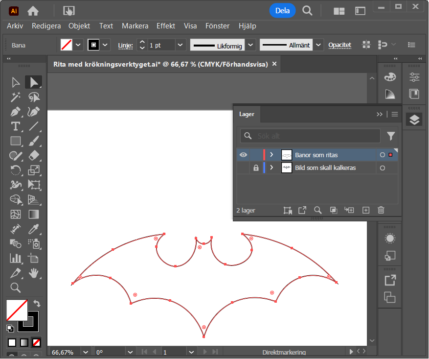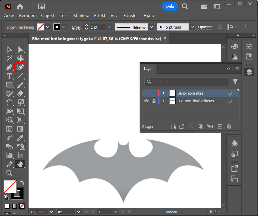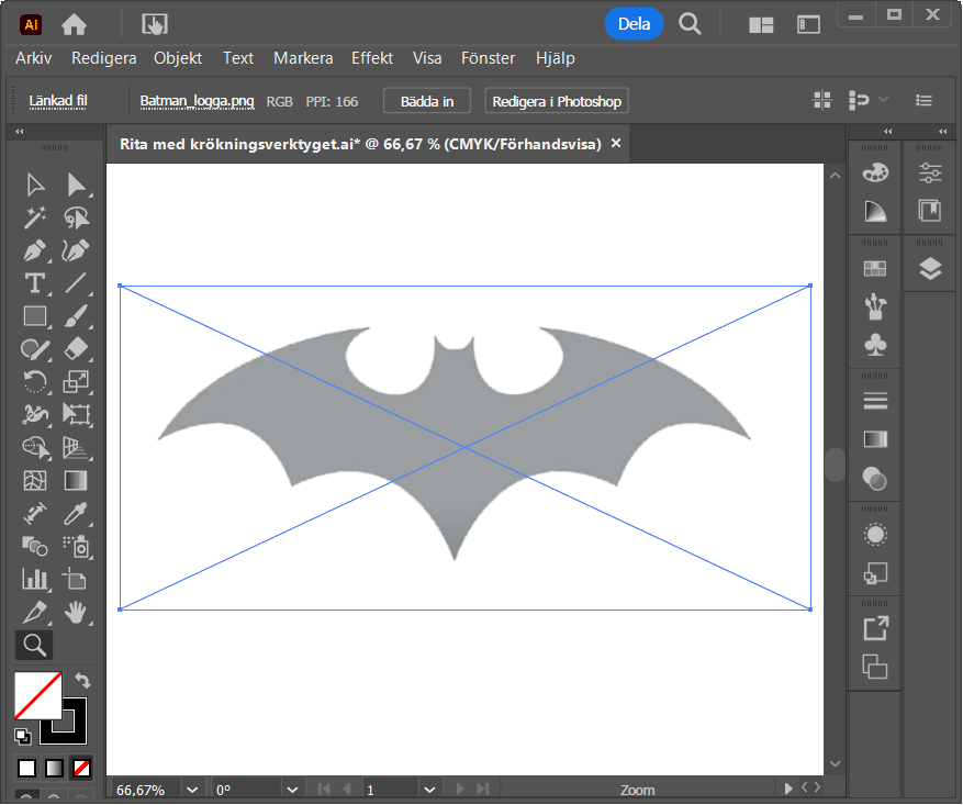 Alla kan rita banor med verktyget KrökningMed det nya verktyget Krökning hos Illustrator blir det mycket lättare att skapa ritningar med banor än med den traditionella metoden via verktyget Ritstift. Verktyget Krökning låter dig skapa och redigera banor med ett och samma verktyg. Du behöver inte växla mellan olika verktyg under arbetet. Detta innebär att även mindre vana användare får möjlighet att ta fram grafik med hög kvalitet. Vi skall prova verktyget genom att kalkera en skannad bild av en logotyp (Batman). Den skannade bilden har monterats i ett nytt dokument hos Illustrator.