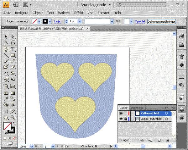 Vi skall kalkera den monterade bilden på logotypen med verktyget Krökning. Resultatet skall sparas i ett eget lager som vi ställt in så att banorna inte har någon fyllningsfärg.