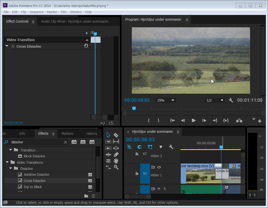 En vanlig övertoning (Cross Dissolve) mellan två klipp hos Premiere Pro.