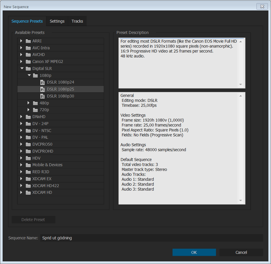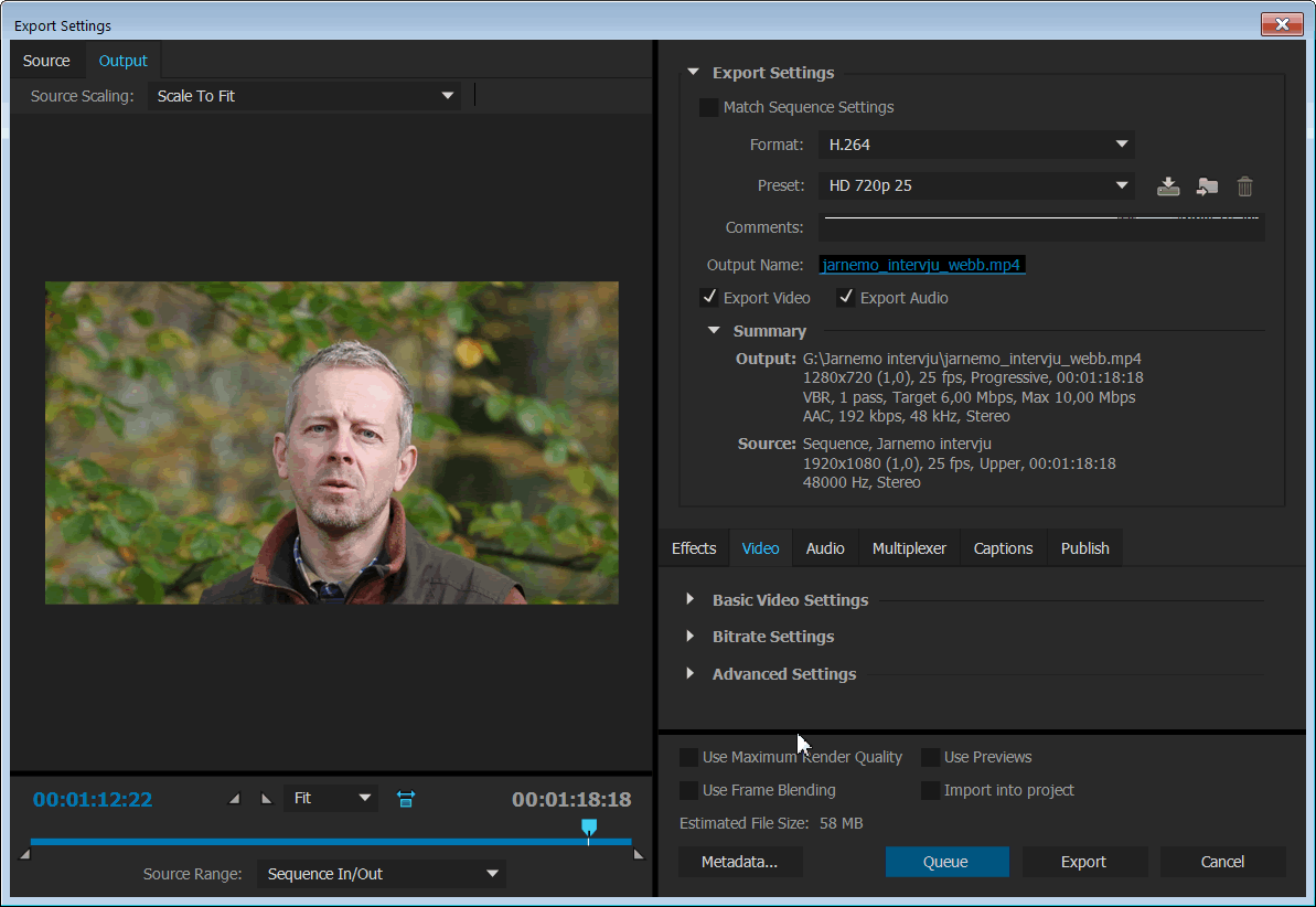 Rendera film för webbenEfter att du slutfört arbetet med redigering kan Premiere Pro skapa en ny sammansatt film med alla ingående klipp, alla effekter, texter och ljud. Filmen lagras då i en enda stor fil som, beroende på kvalitetskraven för visning, kan komprimeras på flera olika sätt. Denna slutliga rendering av filmen kan ta mycket lång tid (timmar). I de flesta fall renderar man både en högupplöst version och ett antal mer lågupplösta versioner av filmen. Den högupplösta versionen fungerar då dessutom som en extra säkerhetskopia av hela projektet. Rendering i olika videoformatFör att rendera en videofilm med Premiere Pro markerar du den aktuella sekvensen och väljer kommandot File-Export-Media. Programmet visar då dialogrutan Export Settings som erbjuder ett stort antal inställningar och alternativ för filmen som skall renderas. För att inte drunkna i alla tekniska inställningar bör du välja någon av de många färdiga förinställningar som finns tillgängliga under menyn vid Presets. Urvalet av alternativ i menyn påverkas dock av vilket Format du väljer. Programmet låter dig rendera filmer i ett stort antal filformat med vitt skilda egenskaper. Filformatet MP4 använder en effektiv komprimeringsmetod som benämns H.264 och som därför resulterar i relativt kompakta filer, vilka lämpar sig väl för publicering på webben. Lagom filstorlek för webbenFilmer som skall publiceras på webben hos YouTube eller Vimeo bör komprimeras kraftigt så att de laddas ner snabbare. I många fall minskar man dessutom fönsterstorleken från Full HD med 1920x1080 pixlar till HD med 1280x720 pixlar eller SD med 720x480 pixlar, vilket ytterligare reducerar filstorleken. För att rendera en komprimerad film för webben väljer du Format:H.264 och Preset: HD 720p 25. Filmfönstret förminskas då till 1280x720 pixlar.