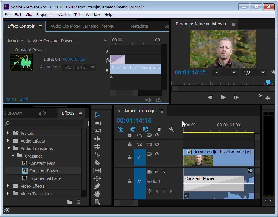Tona in och ur ljud i början och slutet hos klippMan tonar ofta in ljudet i början av ett klipp och använder motsvarande urtoning i slutet av klippet. Den enklaste metoden för att skapa en toning är att först markera klippunkten så att den lyser upp med röd färg. Ta därefter fram fönstret Effects via kommandot Window-Effects. Fönstret ersätter då fönstret Project nere till vänster. Vik upp kategorin Audio Transitions följt av Crossfade så att du välja mellan tre olika typer av ljudtoningar. Den vanligaste toningen är Constant power. För att applicera den på din markerade klippunkt drar du symbolen för Constant Power till klippunkten. Resultatet presenteras som en ljusbrun kvadrat med en symbol för toning. För att du skall kunna se symbolen måste du oftast zooma in tidslinjen kring klippunkten. När du markerar toningen ändras färgen till grått. Toningen får automatiskt en varaktighet på 1 sek. Om du vill ändra detta kan du ta fram fönstret Effect Controls som presenteras uppe till vänster istället för fönstret Source. Om du klickar på symbolen för toningen så presenteras dess egenskaper uppe i fönstret Effect Controls. För att ändra tiden Duration kan du antingen redigera värdet eller klicka på det och dra i sidled.