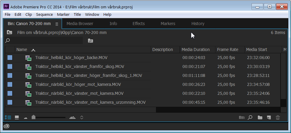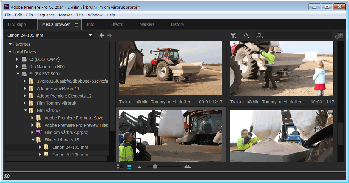 Premiere Pro har ett fönster benämnt Media Browser som kan användas för granskning av klipp, även innan de hämtats in i programmet. Fönstret finns tillgänglig via en egen flik nere till vänster. Du kan ställa in fönstret så att den visar klippen som bilder och det går att öka storleken via reglaget i fönstrets underkant. För att starta och stoppa uppspelning av ett markerat klipp används tangenten Mellanslag. Det går även att snabbspola ett klipp genom att dra i sidled med musen över det (klicka inte). |