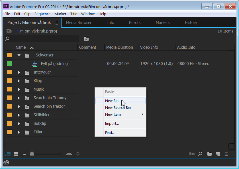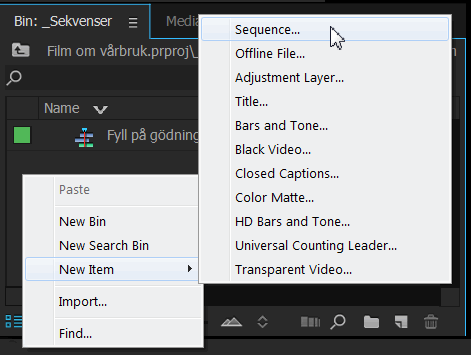 Skapa sekvens och sätt in klipp i valfri ordningHos Premiere Pro måste du alltid skapa en sekvens (eng sequence) för att det skall bli möjligt att lägga in klipp på tidslinjen (eng timeline). Sekvensen presenteras i fönstret Project där du också kan ändra dess namn så att det beskriver innehållet. Det är möjligt att arbeta med flera olika sekvenser i ett projekt. Ofta är det lämpligt att skapa en ny sekvens för varje avsnitt hos filmen. Sekvenser presenteras via var sin flik hos fönstret med tidslinjen nere till höger hos programmet. Skapa en ny sekvensDu kan skapa en ny sekvens på flera olika sätt. Enklast är att högerklicka på en tom del i fönstret Project och välja kommandot New-Item-Sequence.