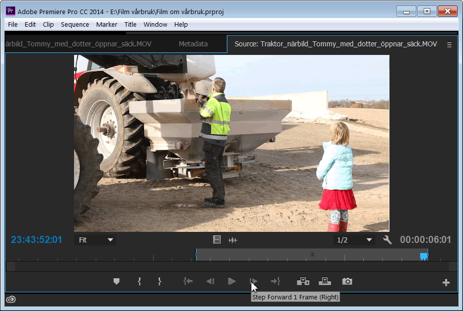 Grovtrimma klippenNär du importerat dina klipp från kameran till ett projekt i datorn så har du ett tidsödande men helt nödvändigt arbete framför dig, nämligen att trimma klippen. Med trimma menas att du bestämmer den exakta tidpunkten både när klippet skall börja, benämnt inpunkt, och när klippet skall sluta, benämnt utpunkt. Förutsättningen för att trimning skall vara möjlig är naturligtvis att du startat kameran en liten stund före och stoppat den en liten stund efter den intressanta händelsen. Normalt utför man trimning i två steg. Först en grovtrimning för varje klipp, oberoende av andra klipp, och slutligen en fintrimning när klippen lagts ihop till en färdig film på tidslinjen. Glädjande nog har de flesta programtillverkare enats om samma tangentkommandon vid arbete med trimning av klipp. Tangenten mellanslag används för att starta och stoppa uppspelning av filmen medan tangenten ”i” sätter inpunkt och tangenten ”o” sätter utpunkt under uppspelning. Hos Premiere Pro dubbelklickar du önskat klipp i fönstret Project så att det öppnar sig i fönstret Source uppe till vänster. I detta fönster finns knappar för att starta/stoppa, sätta inpunkt eller utpunkt, stega en bildruta framåt eller bakåt m m. Om du placerar muspekaren på något av knapparna så visas en förklarande hjälptext. Du kan förstora fönstret tillfälligt genom att dra i gränslinjerna, vilket underlättar när du skall söka upp exakt var klippet skall börja och sluta. När du bestämt in- och utpunkt presenteras dessa via blå klammersymboler på tidslinjen under klippet. Vid behov kan du naturligtvis flytta eller ta bort dessa symboler.